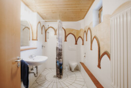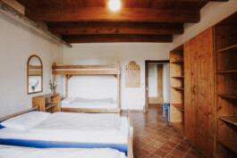 Al pianterreno ci sono i servizi igienici con 3 bagni, 4 lavandini e 4 docce. Al primo piano c’è un bagno comune, al secondo piano un altro bagno comune.